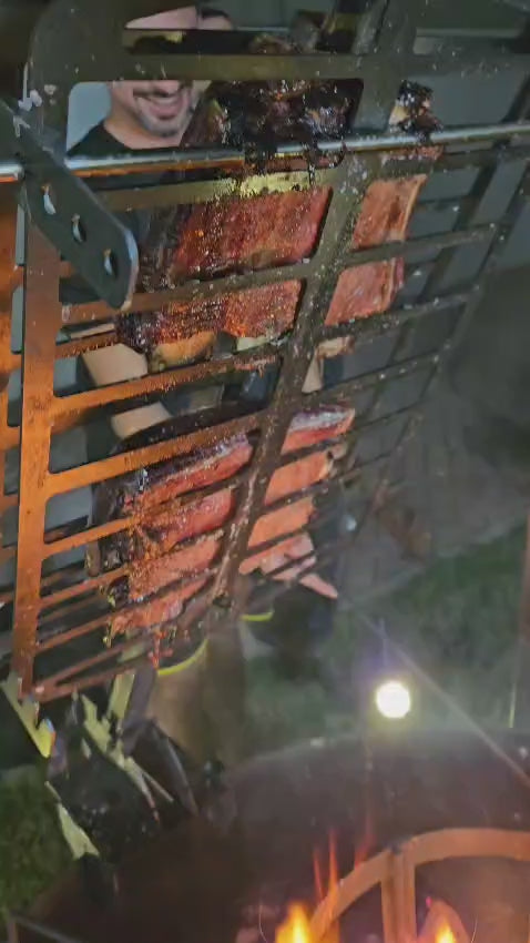 ⢠T-Cross asador â Adjustable meat cross for slow-cooking over open fire